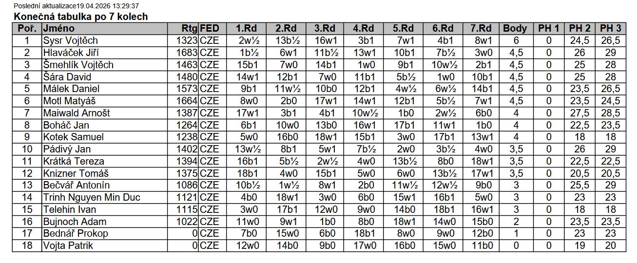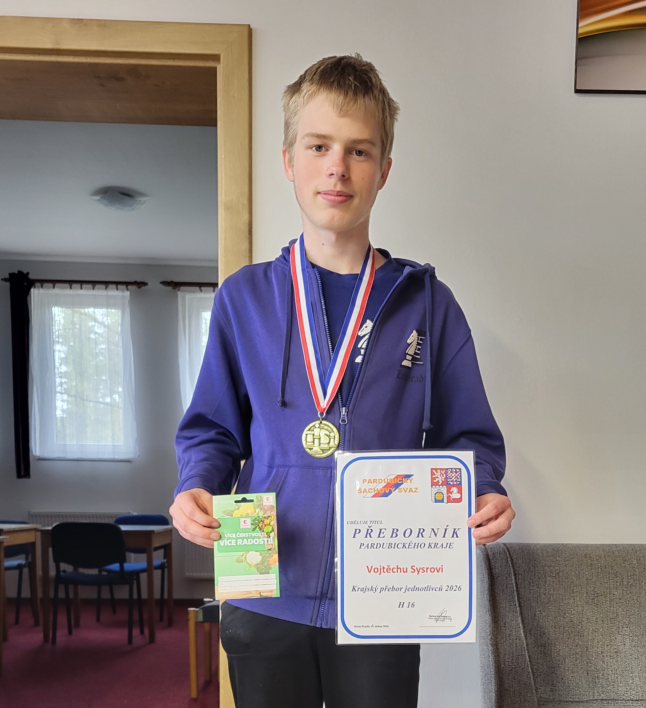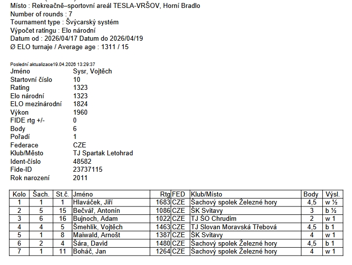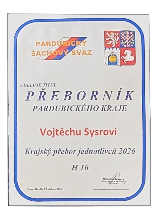 Ve dnech 17. až 19. dubna 2026 se ve Vysokém Bradle hrál krajský přebor Pardubického šachového svazu H16 – chlapců do 16.let. Za účasti 18.hráčů se krajským přeborníkem stal hráč našeho oddílu Vojtěch Sysr.